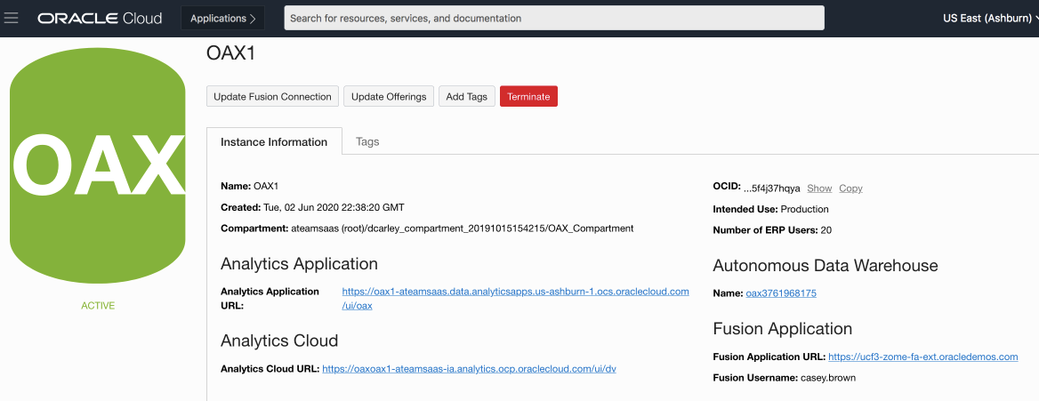Click on the provisioned FAW instance and you see the screen below. It shows the instance metadata, provides administrative links and links to FAW, OAC, ADW and FA.