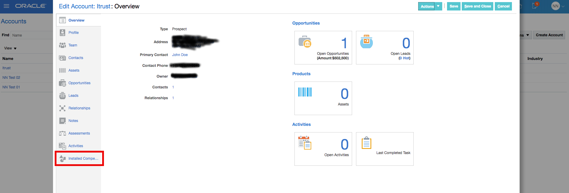 The screen shot below shows the icon for the custom page – the location where sales and service representatives may enter their knowledge about competitive products being (co-)installed at their own customer sites. The custom page is accessible under the Edit Account functionality.