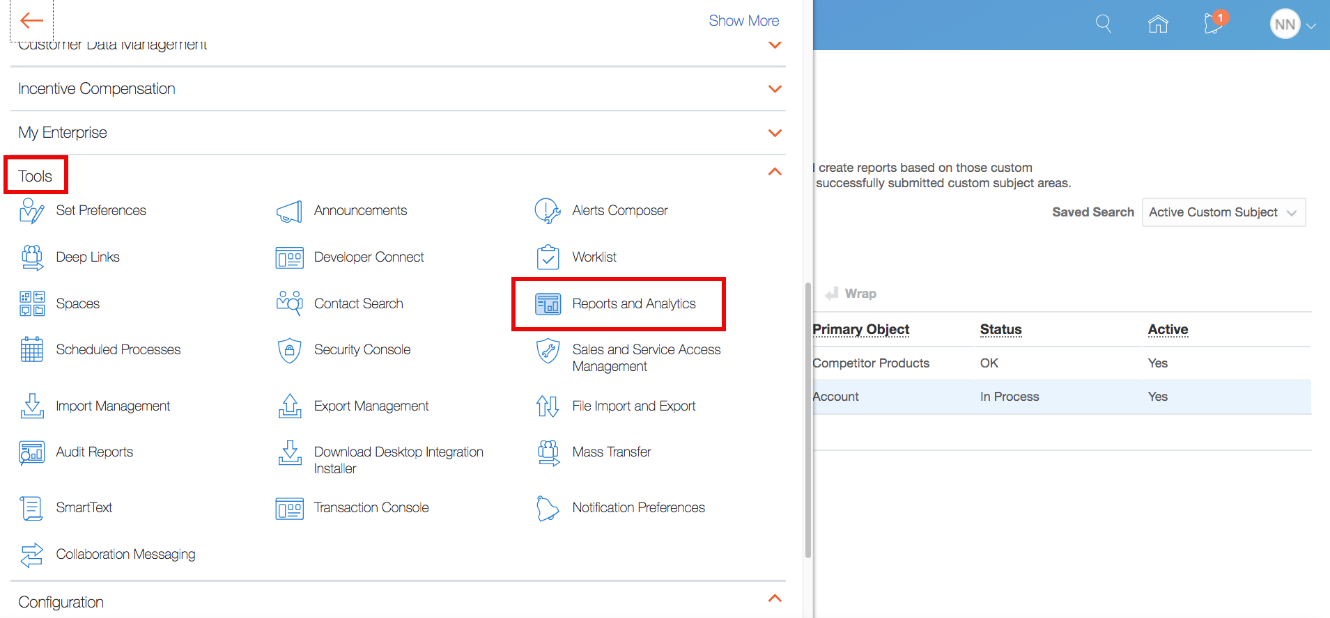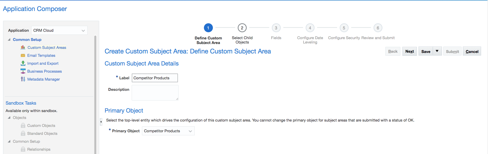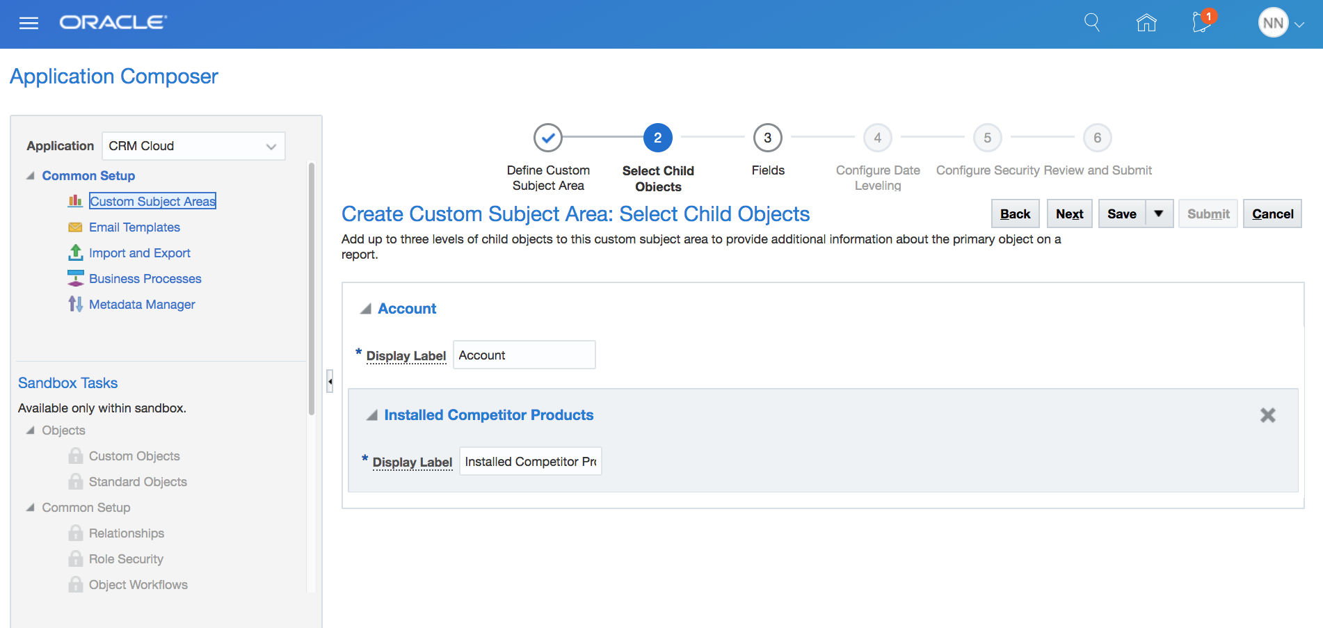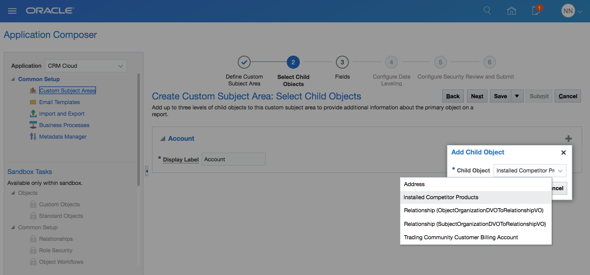 As a next step we will add the Custom Object for the Installed Competitor Products as a new Custom Subject Area. As we remember that object was created as a Child Object of Accounts.