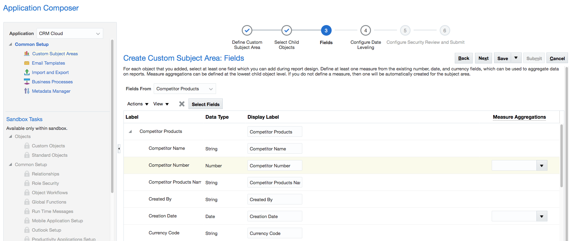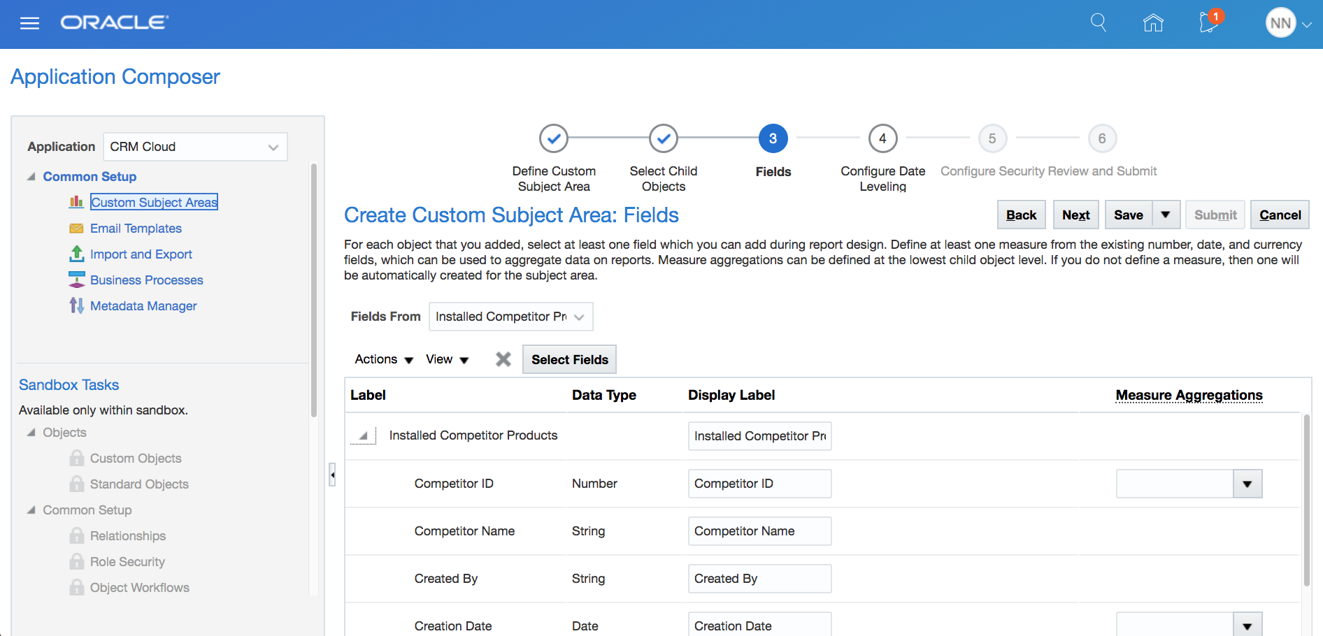 Standalone objects will appear directly in the list of choices when creating a new Custom Subject Area. In a sequence of steps, the fields and any possible aggregations can be enabled and entered, as shown in screenshot below.