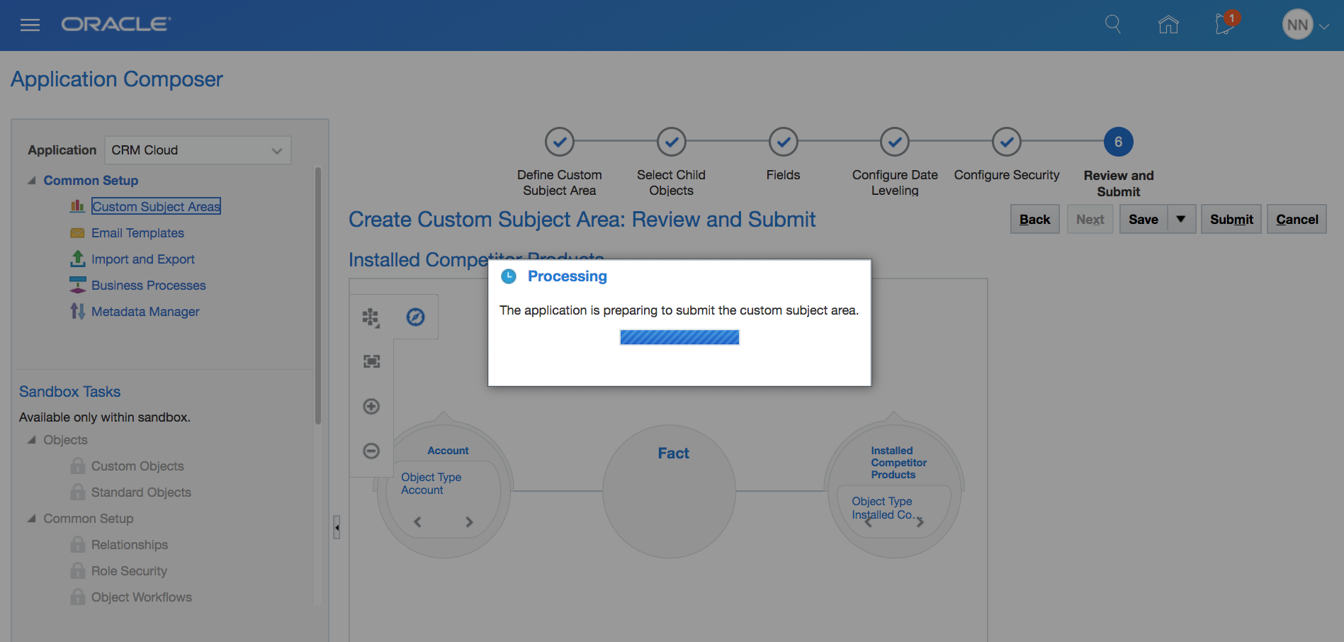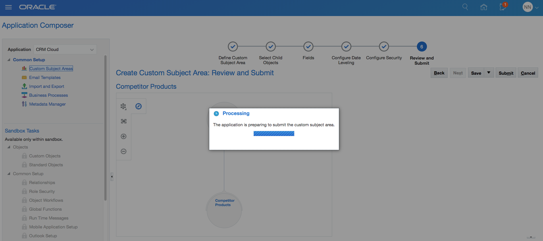 Again, and similar to the previous submitting of a custom object, the AppComposer handler for Custom Subject Area will compile all information from its dynamic data structures and prepare the creation of the according Custom Subject Area.