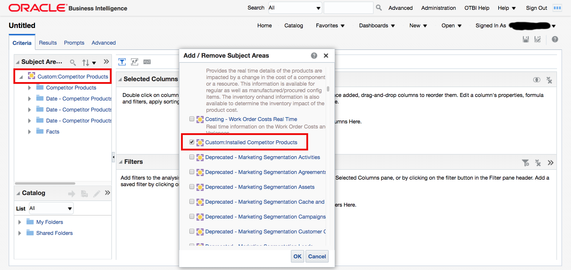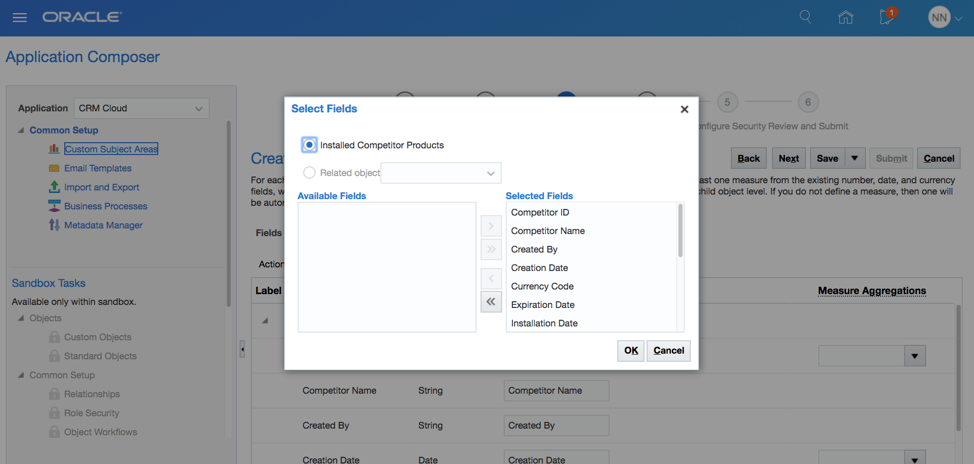 In screenshot below, we have added the custom subject area for Competitor Products and opened the dialog box to add more areas like Installed Competitor Products. It is important to remember that the Custom Subject Area start with the Name Custom: in the list of values.