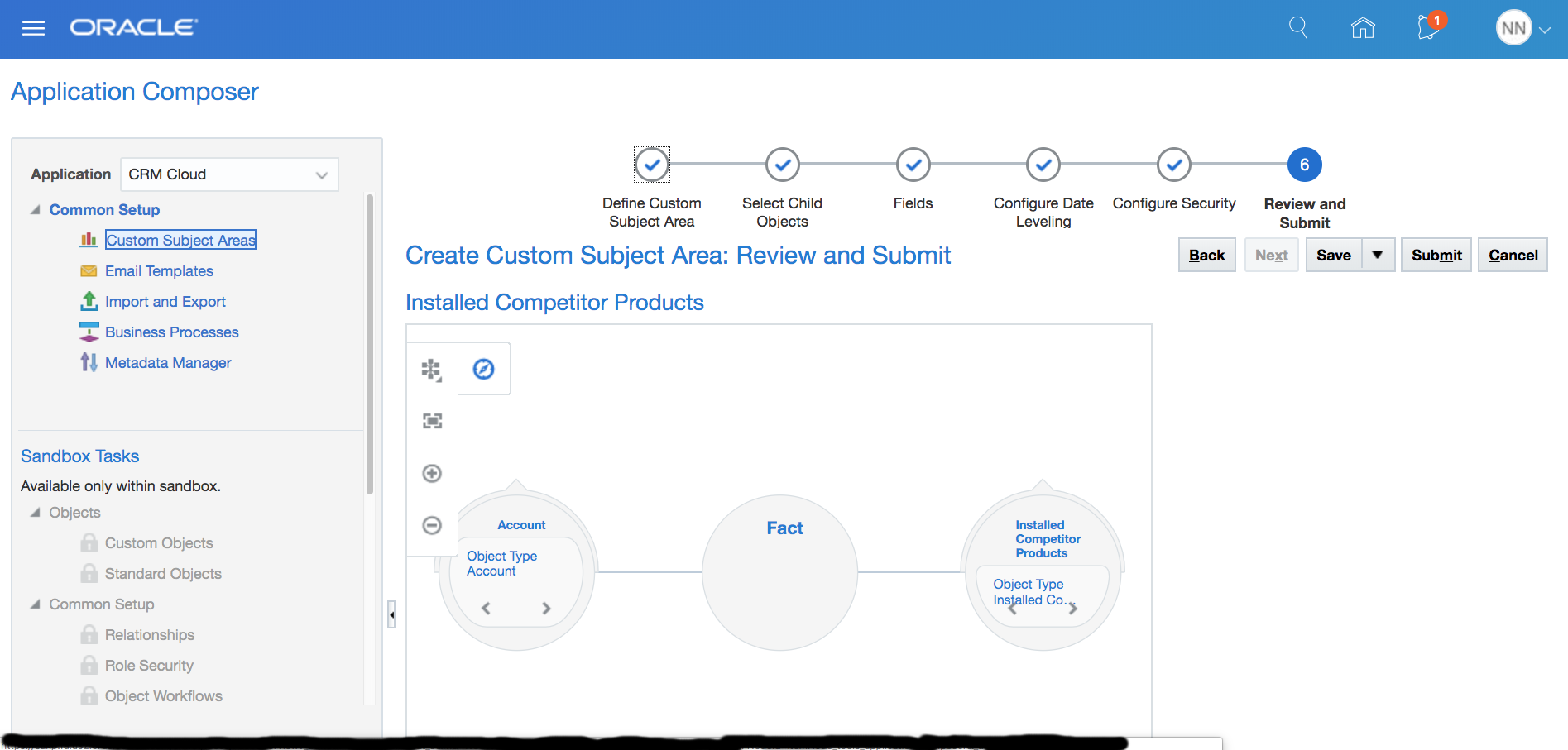 Before submitting the new subject area, the summary screen as shown below shows the relationship of new object to the standard object Account.