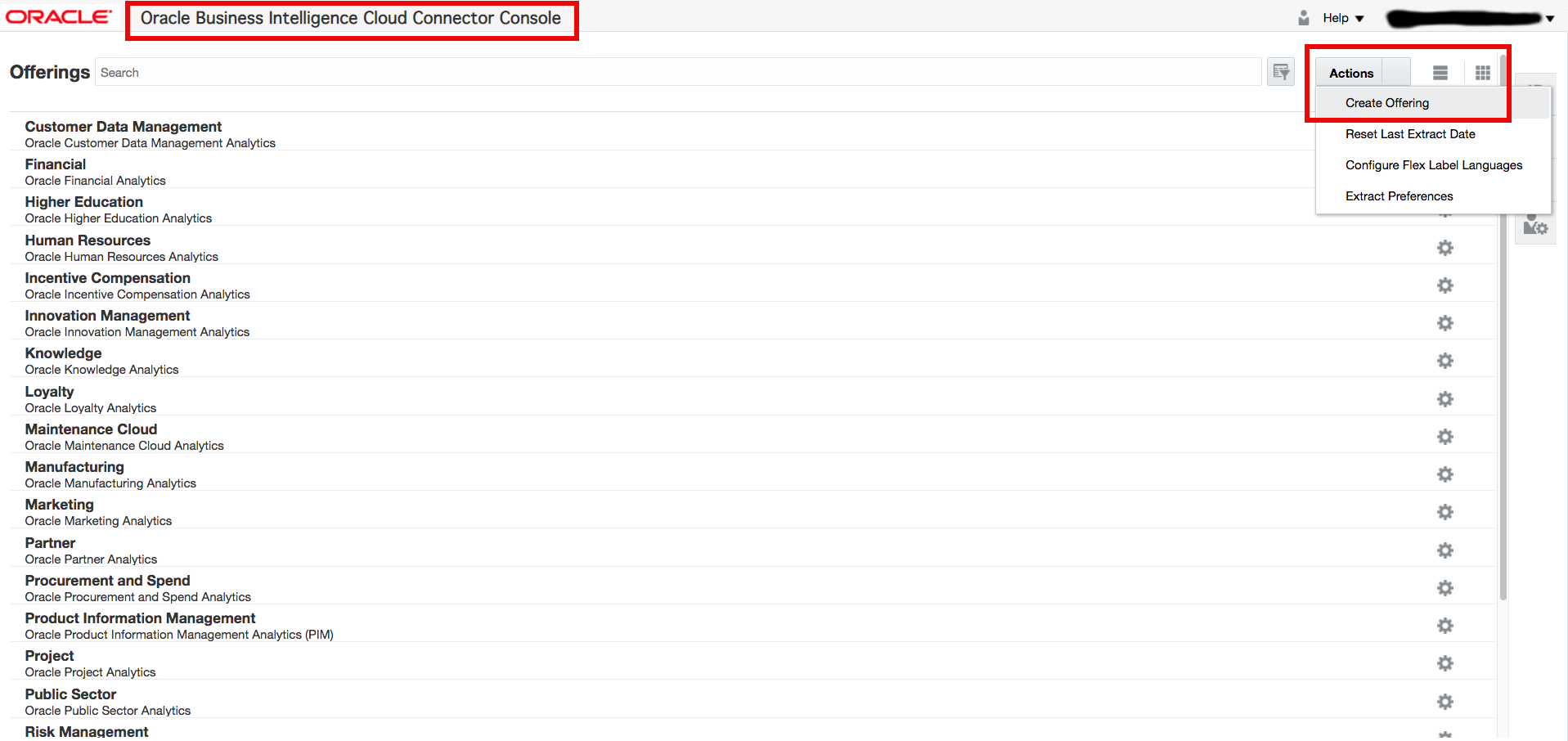 The screenshots below and the following explanations will highlight how to create a custom offering containing custom data sources. Once the page Manage Offerings and Data Sources has been opened choose the menu item Actions -> Create Offering.