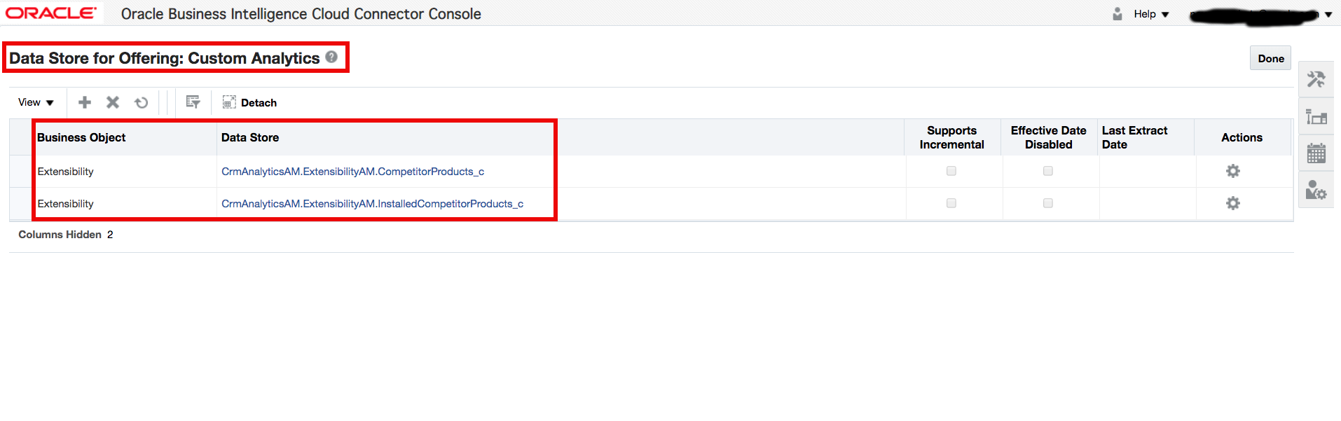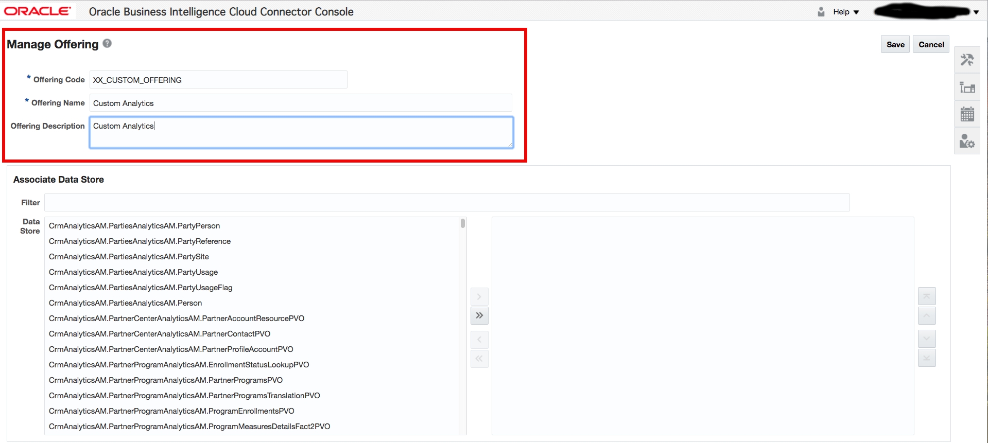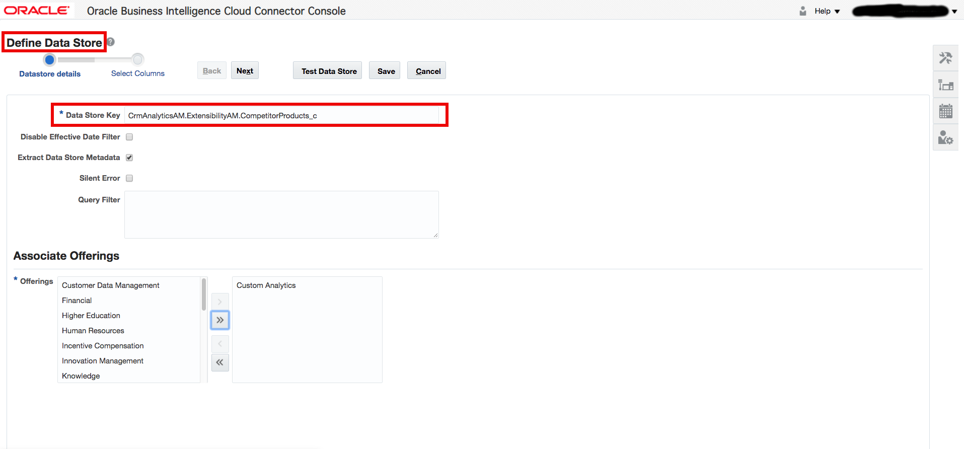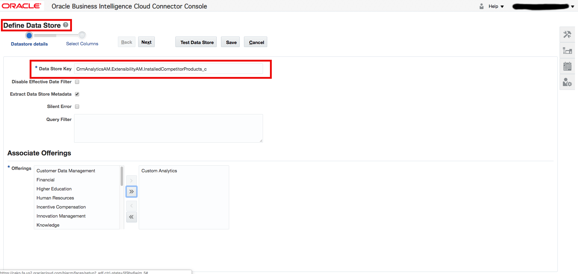 As a next step register the custom data sources in BICC. Most tricky part might be to determine the internal Name of this custom subject area. As the screenshot below shows, the Custom Object Competitor Products becomes an custom subject area with the Data Store Key named CrmAnalyticsAM.ExtensibilityAM.CompetitorProducts_c. We have to type exactly this name in the field Data Store Key to make it accessible from BICC. At this point it makes also sense to assign it to our freshly created custom offering for an easier accessibility.