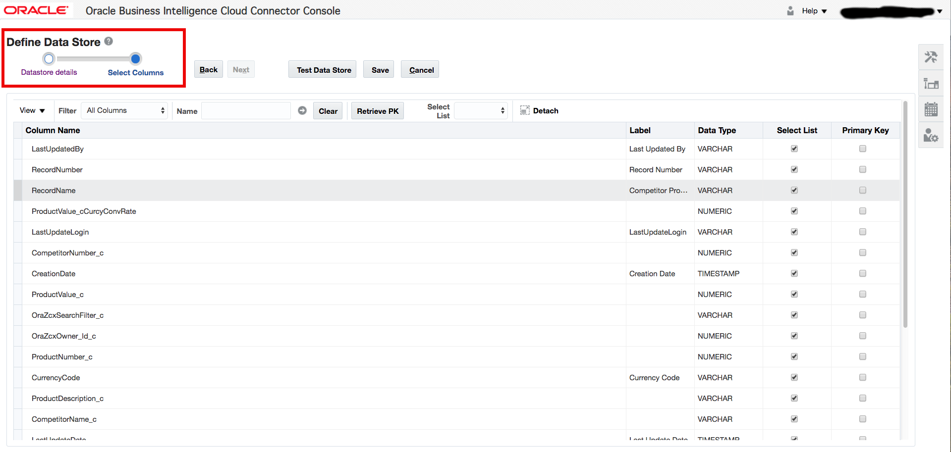 In the second part of this creation page we are able to choose the columns to be included in this new custom data store and also identify the primary key for this object.