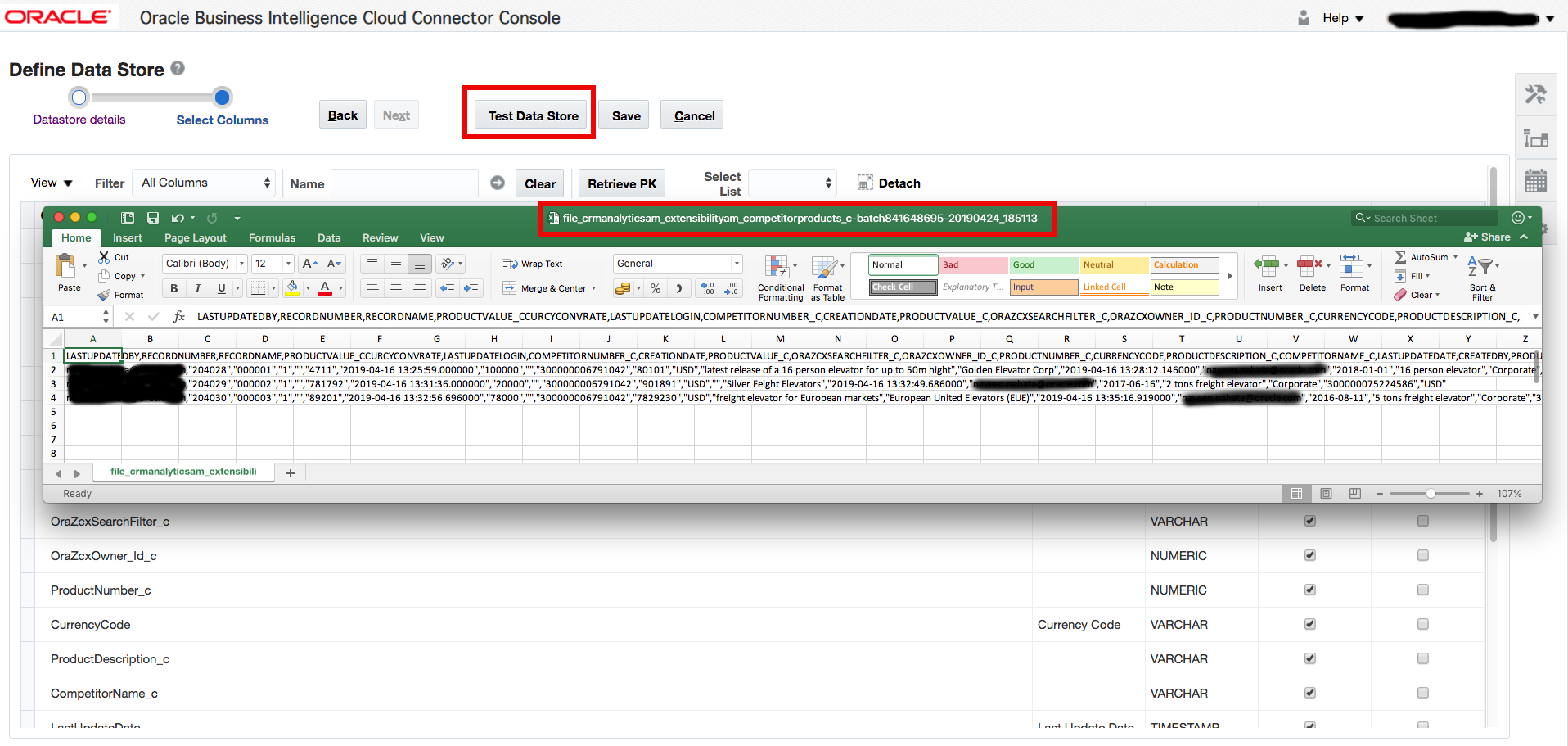 As a final step of this Data Store creation task we might want to check the results. This can be done by hitting the bottom Test Data Store as shown below. The test will run a data extraction across a few limited records and provide a zipped extraction file. The screenshot below shows the result as being opened as uncompressed CSV file in Excel. Once this test succeeded we can be sure the new custom data source works as expected.