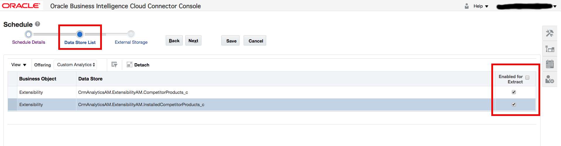 Once finished the registered custom data stores will appear in our custom offering as shown below and we are ready to run our extracts including these custom objects.