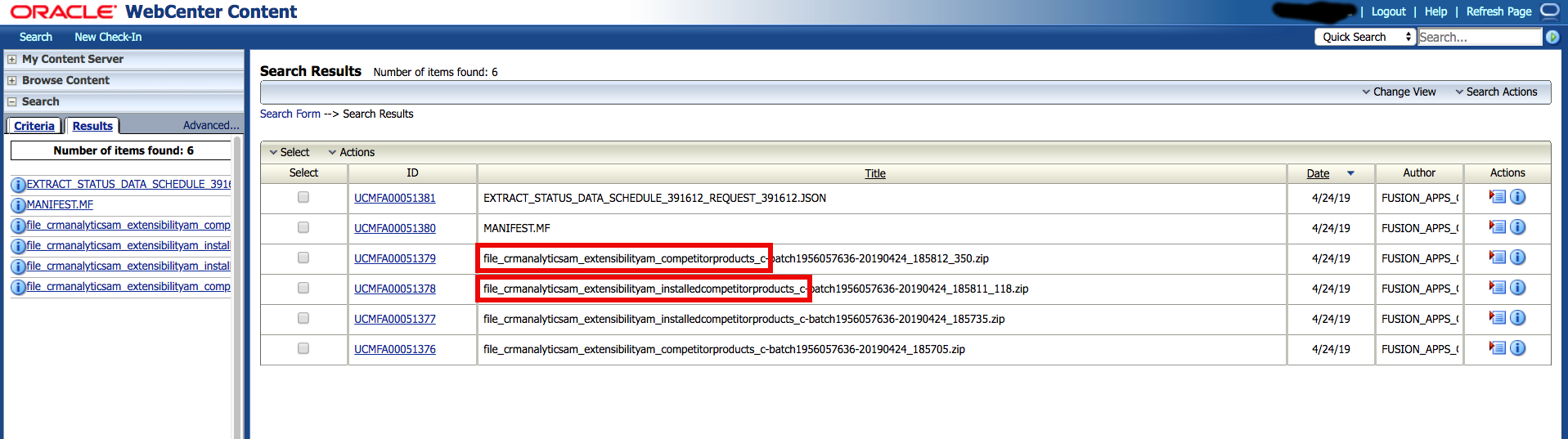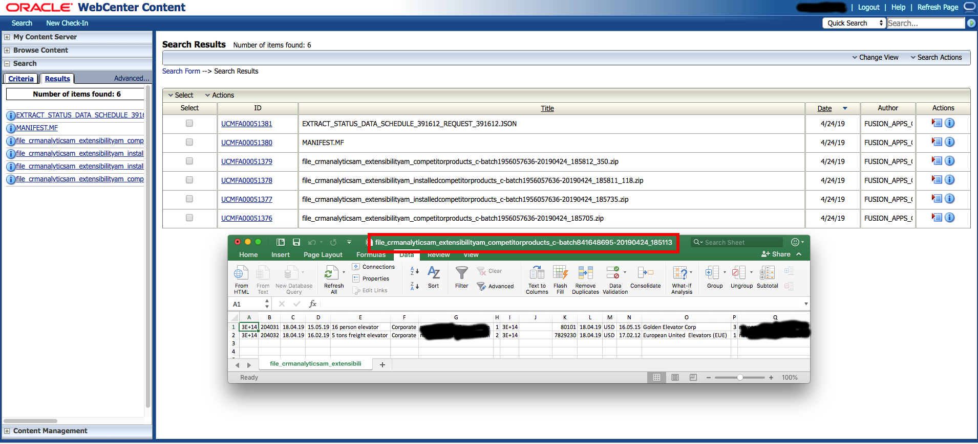The results of this extraction have been stored in UCM as configured. Screenshot below shows the extracted data in single files for each custom object.