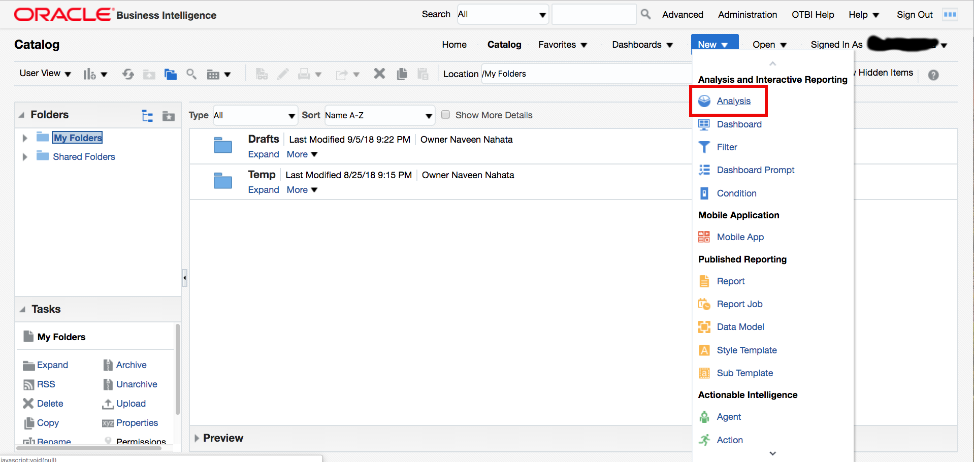 After opening the Browse Catalog link you have to click the New menu item and there to activate the Analysis menu.