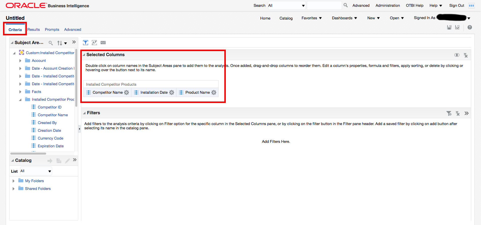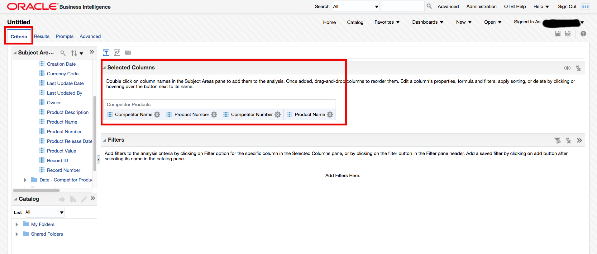 In the design page under menu tab Criteria we create an analysis using our custom subject areas and select a few columns for reporting as shown below.