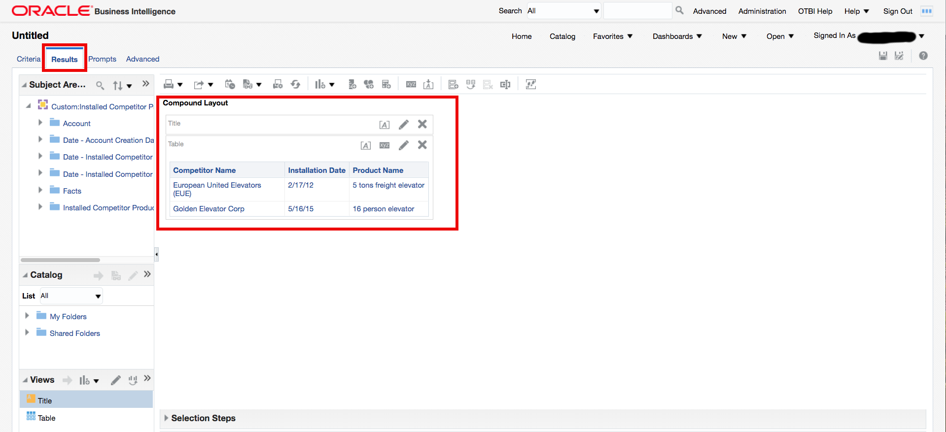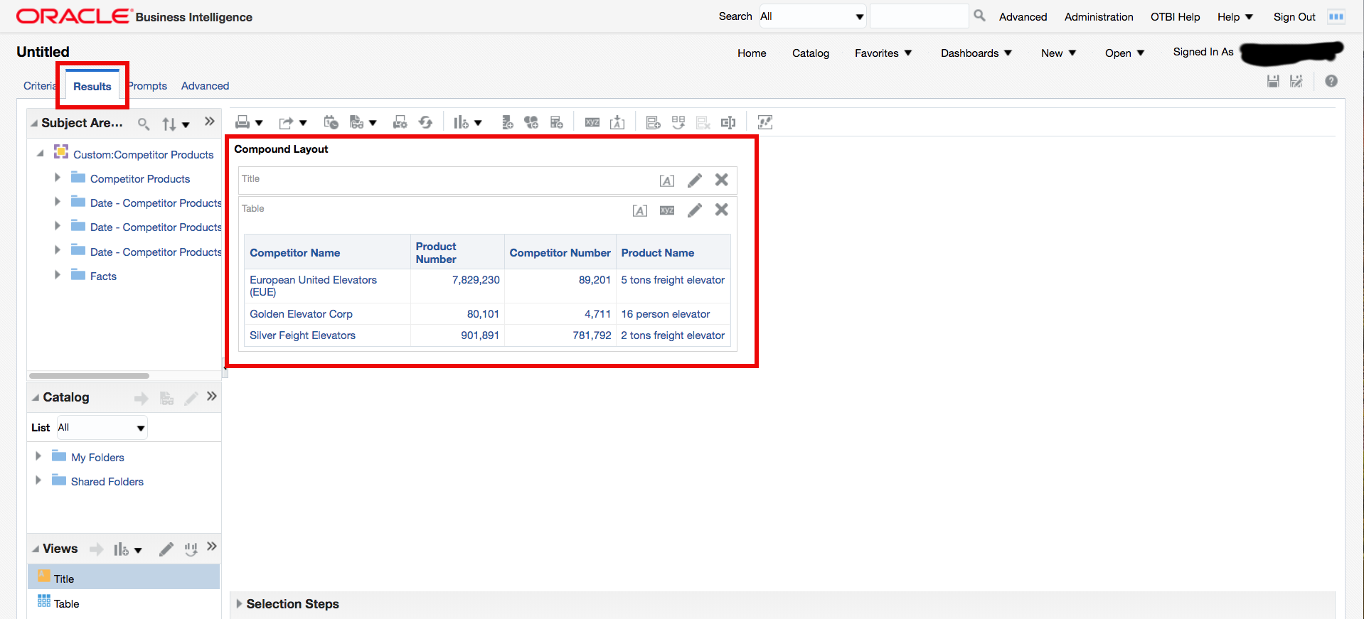 Once done we click on the Results tab and will see some test data. At that moment or BI runtime components have accessed these custom subject areas by their internal names and those names can be found in runtime log files.