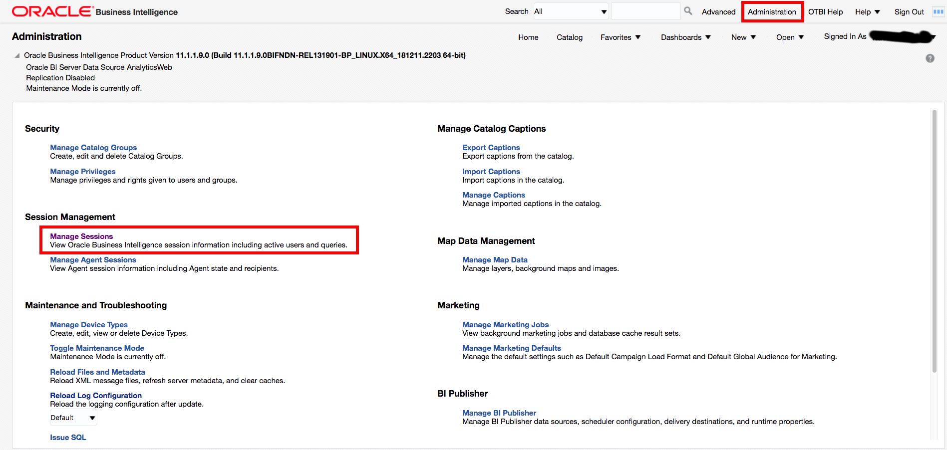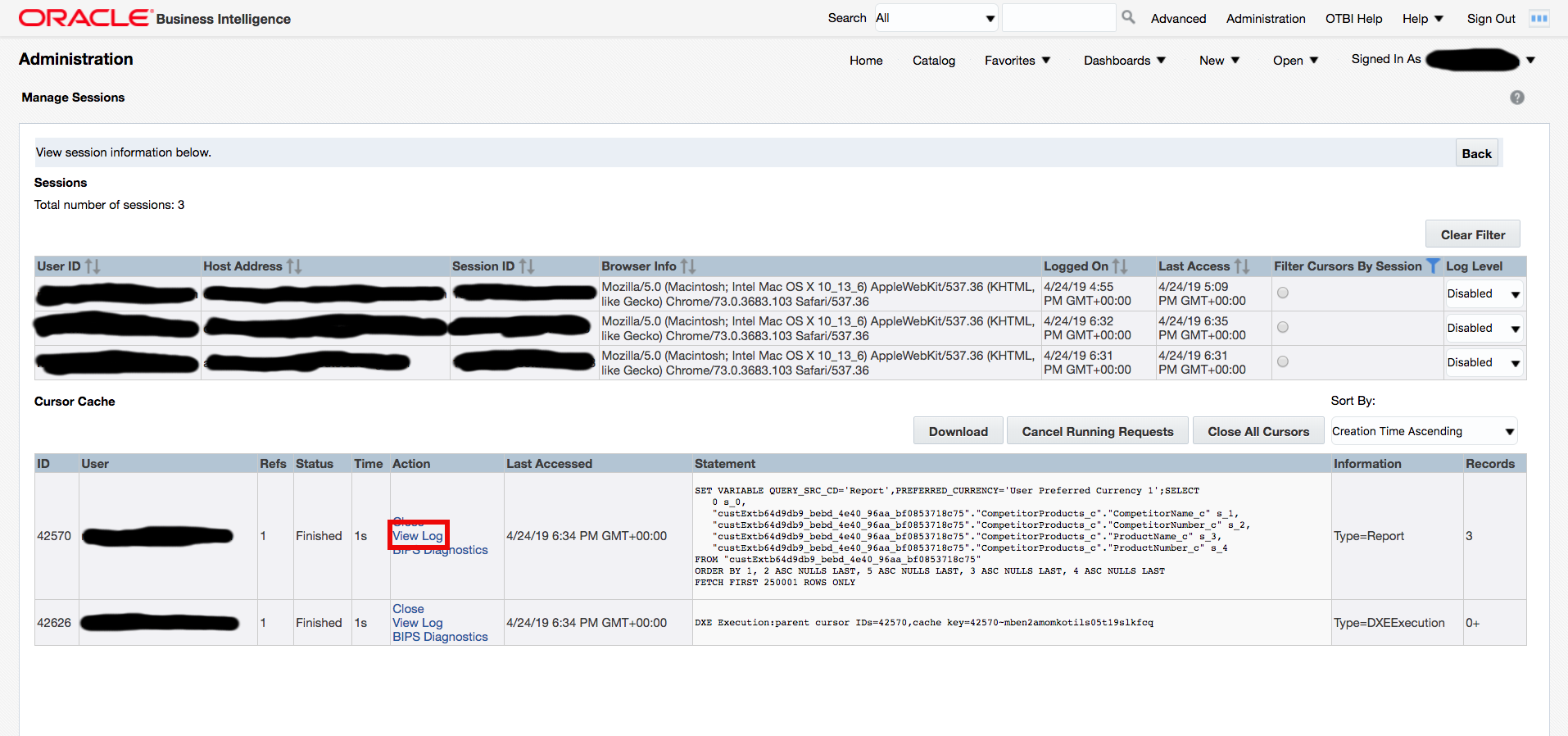 Under the main menu item Administration in BI we will find the log files as being created when accessing the test data. To access this information, we have to open the menu item Manage Session under Session Management.
