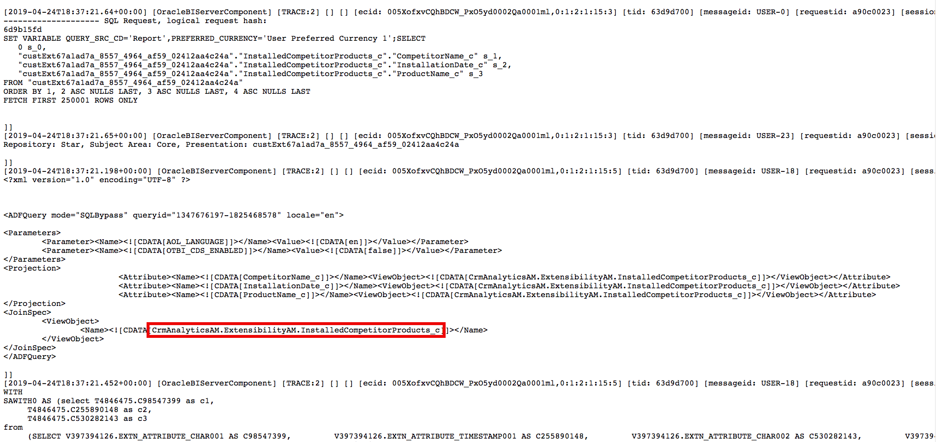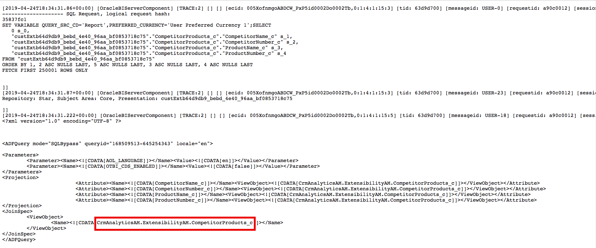 After opening the log information in a text window, you can find the physical Custom Subject Area name inside those logging as shown in both screenshots below. These are the values to be used in BICC later when creating the custom data stores.