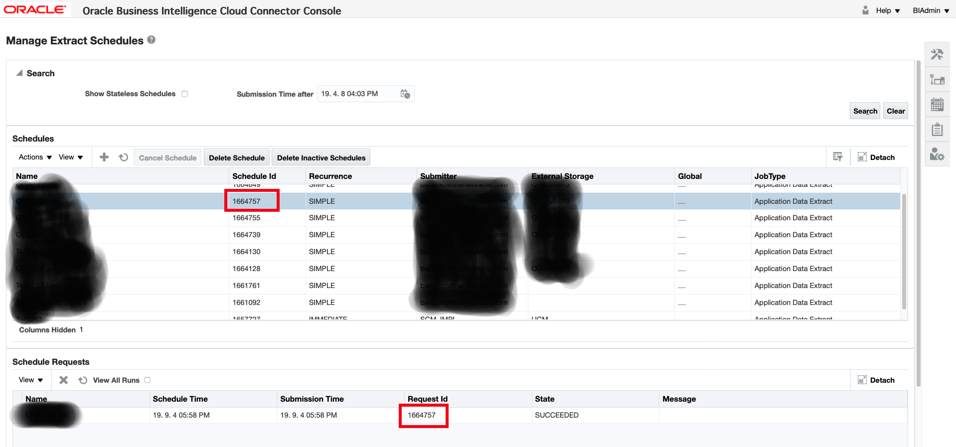The Schedule ID is used as a main grouping element for extraction runs. Every extraction run, independent from being a single ad-hoc run, a single scheduled run or a series of periodically runs performed more or less frequently, has a unique Schedule ID and Request ID. Only periodically executed runs will share the same Schedule ID and using an alternate changing number as Request ID. The link between a Schedule and a Request can be mapped between the file name and the according run time information as shown in BICC UI below.