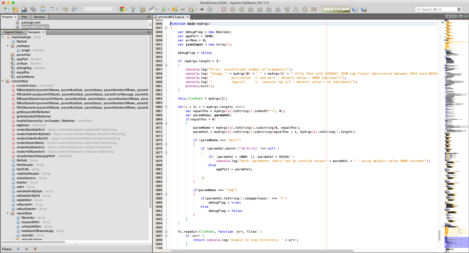 Calling the main() function and passing the command line arguments will initiate the creation of extractStats object. There is only one mandatory argument required with the directory name where the EXTRACT.JSON files can be found. Another parameter is the web port which will be handled as optional. If no argument has been passed the default value of 3000 is taken. Finally, a third argument might be passed to enable the output of log information. Its also an optional parameter and log output is disabled by default. Some code lines in main() will validate these parameters at the beginning and before further processing to initiate the extractStats object. As stated before, the extension for a dynamic handling of hostname could be added by passing one more command line argument with an according value.