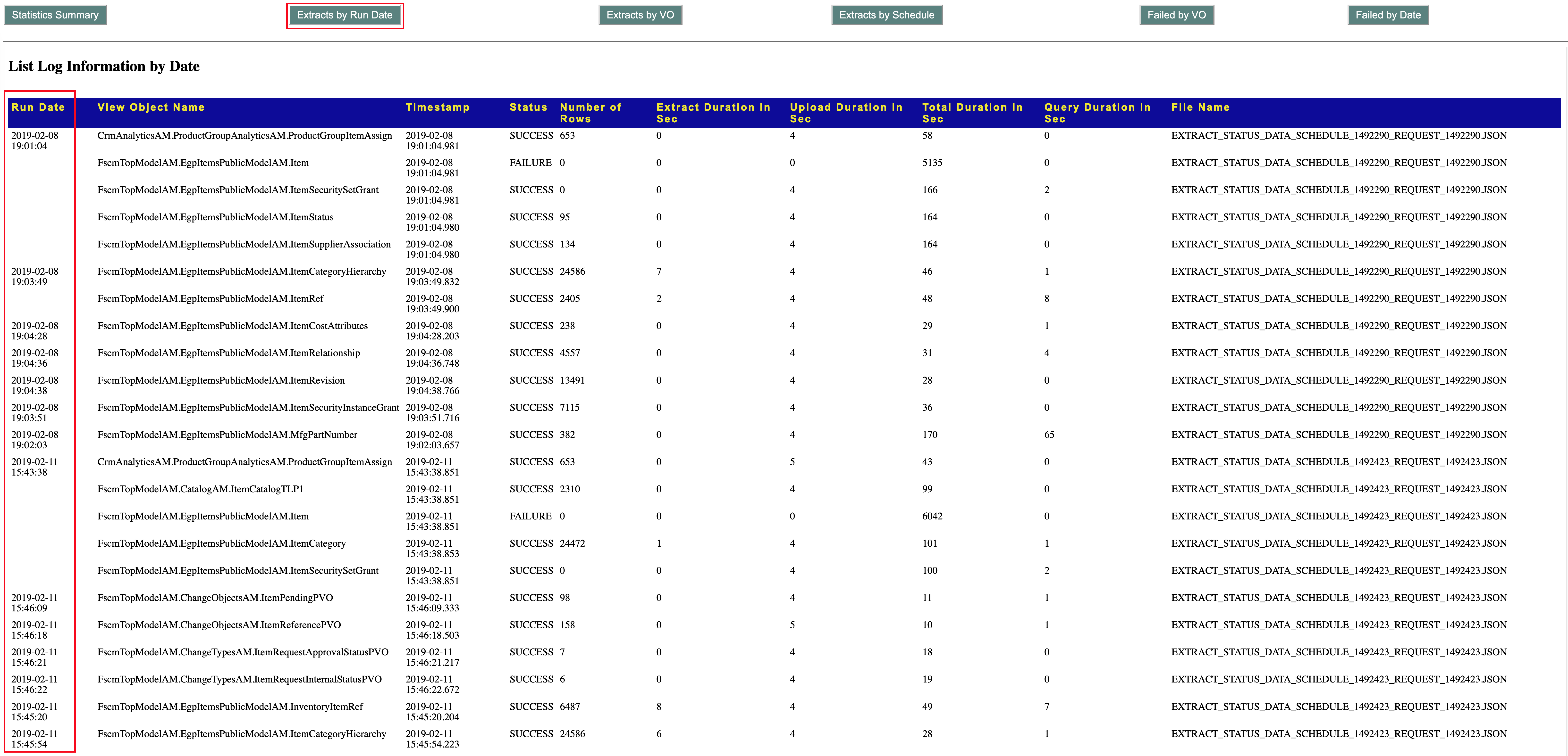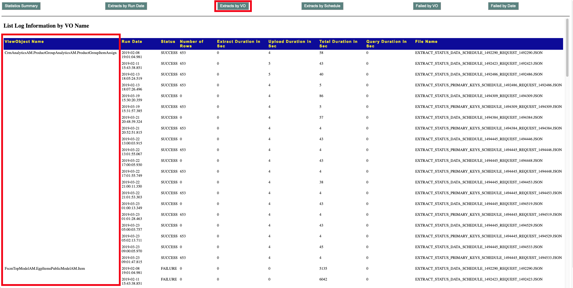 This JSON log file will be created for every extraction run – independently whether this run has resulted in an error or was successful. In case of an error there will be no extraction output (MANIFEST file and zip files) existing, while the JSON file will contain an error message pointing to the root cause of this issue. Statistic data for every single View Object in a dedicated extraction run are listed as follows: