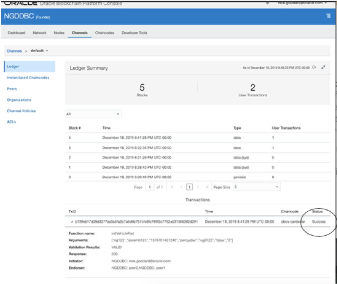 Again, by clicking on the latest block you will reveal the TxID, which is different from the TxID on creation; with date and status showing the Vehicle Part was successfully transferred to obcs-user from ng0123.