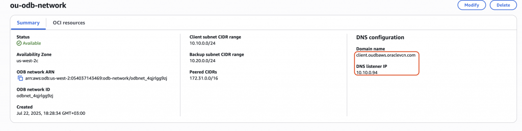 The ODB Network has the following details. Please notice the default DNS domain configured (client.oudbaws.oraclevcn.com) and the IP address of the OCI DNS listener endpoint (10.10.0.94).