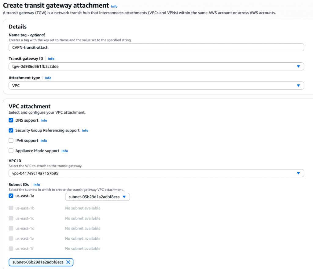 - Create Transit Gateway and attach both the VPCs to it. Make sure the transit VPC attachment is in the same AZ as of ODB network.