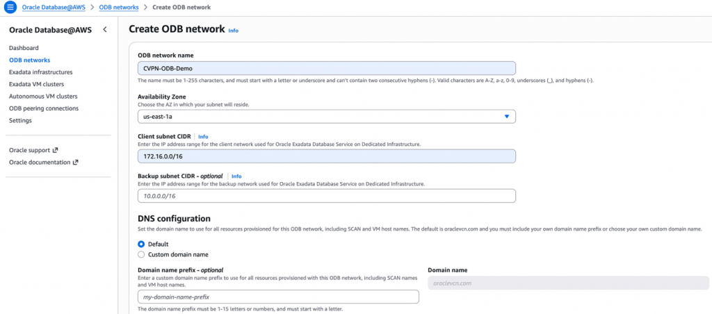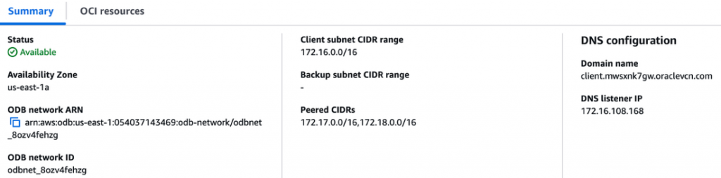 - Finally add the client VPC CIDR in the Peered CIDR section of ODB network for ODB to route traffic.