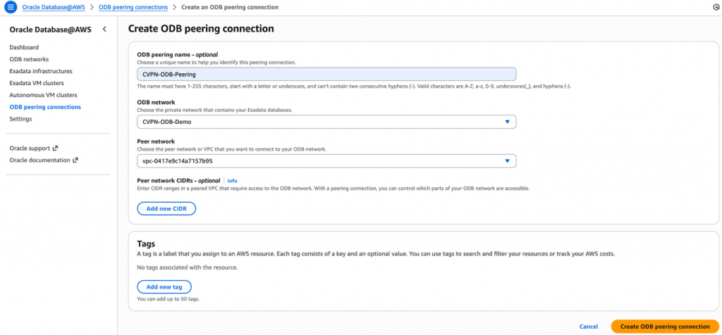 - After the VPCs are in place, navigate to Oracle Database@AWS → ODB peering connection.