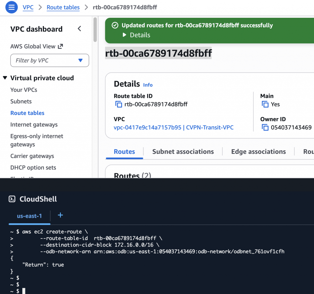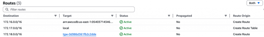 - On the client VPC subnet route table, add a route for ODB network pointing to TGW