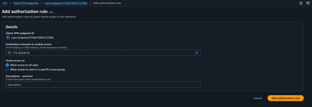 As a result, once a remote user connects to the AWS Client VPN endpoint, they can reach any destination that the Client VPN-associated subnet has a route to provided an authorization rule permits access (and security controls such as security groups/NACLs allow the traffic).