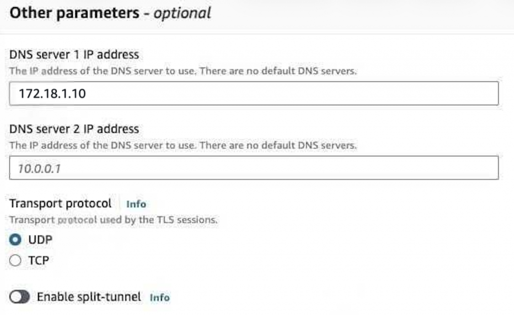 - Edit the client VPN’s DNS server IP, Client VPN endpoints –> Modify client VPN endpoint –> update DNS server IP. Use route 53 resolver’s inbound endpoint IP here so that client VPN can resolve OCI hostnames.