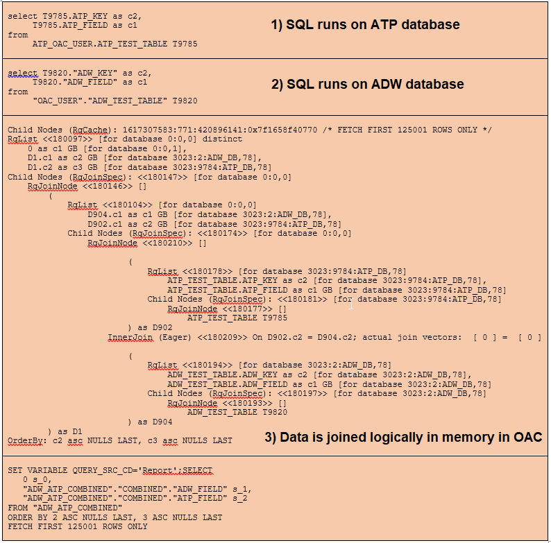 The physical SQL is ran individually on each database then joined logically within OAC. Therefore, this may not scale with larger datasets. A safer approach for larger datasets may be to keep the two data sources separate and drill from one to another using Analysis Action Links or DV Data Actions. Another approach could be to consider a database link as outlined in this article on Making Database Links from ADW to other Databases.