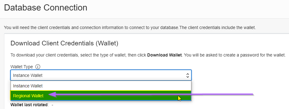 From either database go to Database Details -> Click on DB Connection -> From the Wallet Type dropdown – select Regional Wallet -> Click Download Wallet.