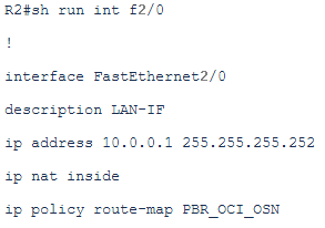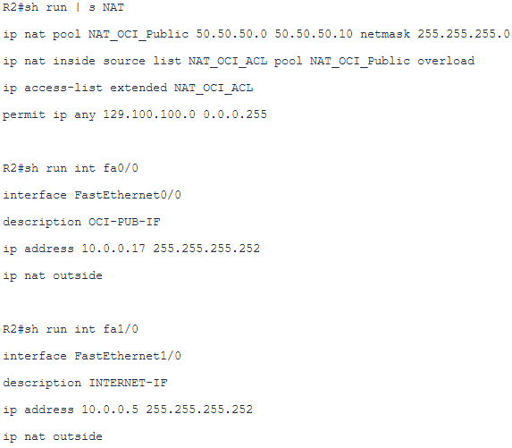 The NAT will be activated only for interfaces fa1/0 and fa0/0 as outside interfaces and on fa2/0 as inside interface. On the fa0/1 there will be no NAT because using the private peering all the traffic will flow from the customer side using private IPs as source.