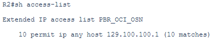 # define the access-list to catch the traffic that needs to be routed using the policy based routing and not using the routing table that is directing the traffic to 129.100.100.1 (representing OAC instance in OSN as an example) via the FC private peering: