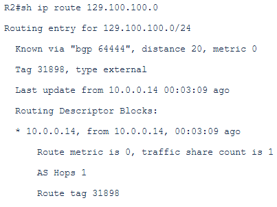 The routing table on the CPE looks like to route the traffic back to 129.100.100.1 it uses the next-hop 10.0.0.14 (private peering):