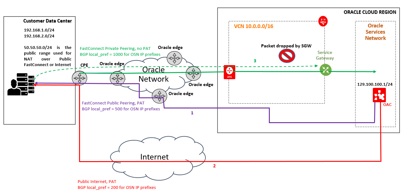 In OSN we have couple of services (https://www.oracle.com/cloud/networking/service-gateway.html) –  in our case we will use OAC as an example that can initiate connections back to customer On-Premise public IP or VCN VMs. These types of connections are usually called Service to Consumer. The case discussed here is when the OAC is initiating connections to On-Premise machines when the public and private FastConnect are configured. If Public FastConnect is not configured, the Internet is used for routing the traffic from OAC to customer public IP located On-Premise. The private FastConnect is not used by OAC as of now because the SGW is not supporting connections from OAC to the customer On-Premise.