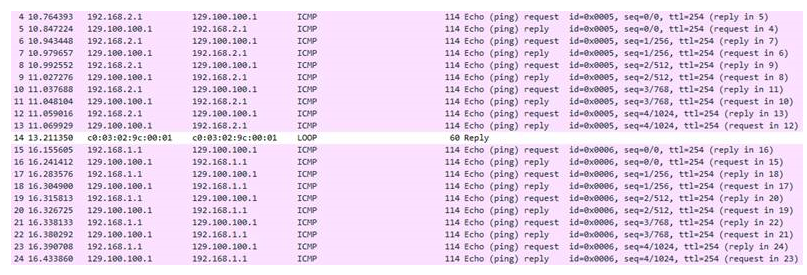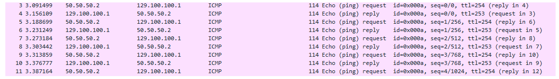 4. Traffic started to work again NAT-ed (the packet capture done on the Internet link reveal the source IP address of 50.50.50.1):