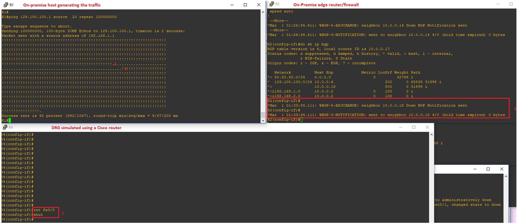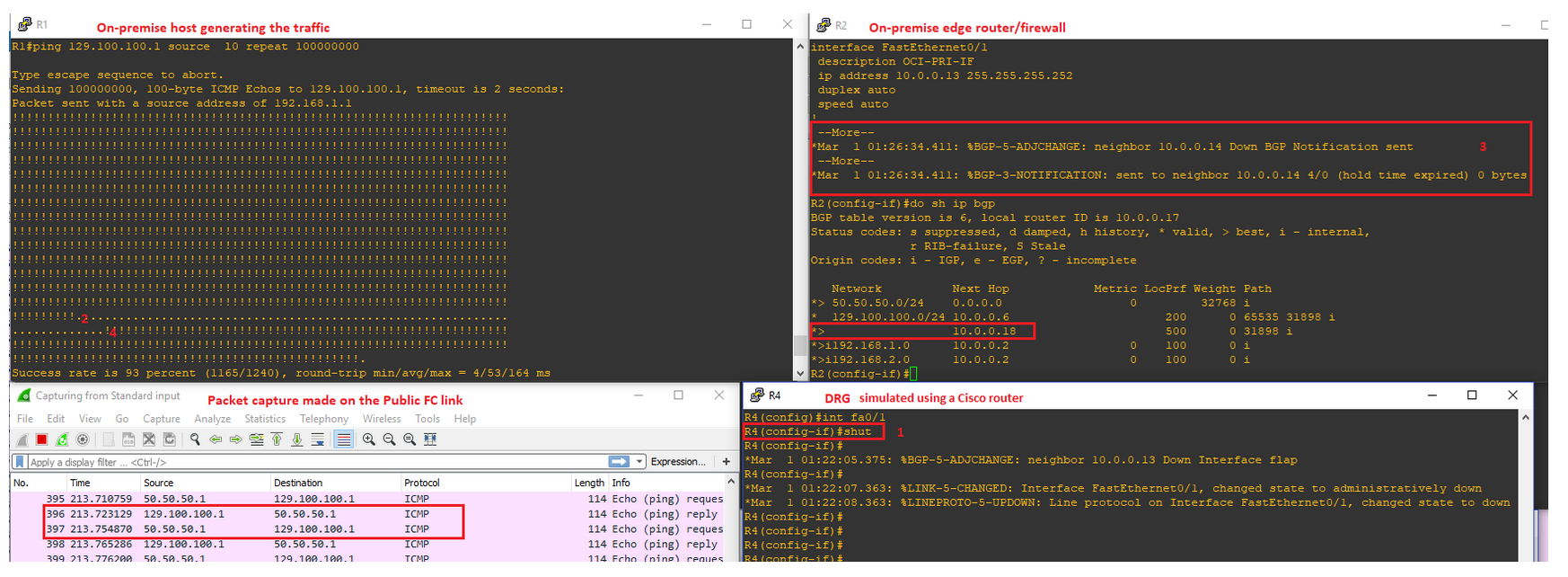 To simulate a failure of Public Peering and observe the switchover process we will simulate a FC public peering failure by putting the FC public peering interface in the down state (BGP keepalive of 60s and hold-down of 180s are used):