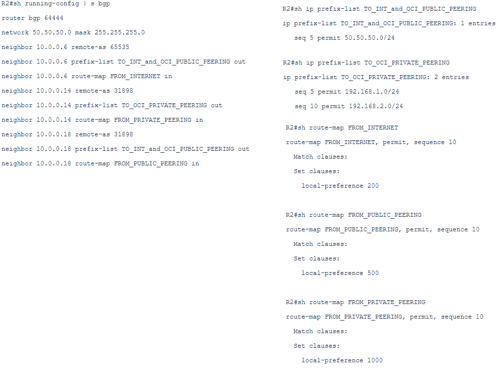 A2) OSN CIDRs announced via BGP as more specific routes on Private Peering and less specific over Public Peering (for example 129.100.0.0/16 announced on Public Peering and 129.100.100.0/24 on Private Peering):