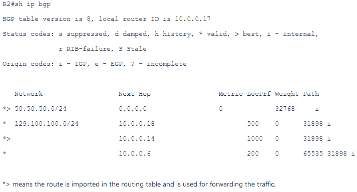 In this case, based on the configuration made above, the BGP table will look like: