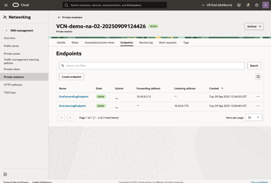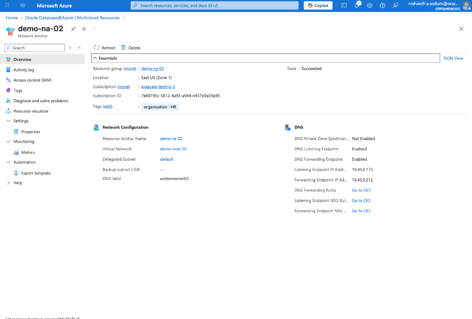 After the provisioning of Network Anchor, we will have two OCI DNS endpoints provisioned Both the Listening and Forwarding endpoints are displayed on both Azure and OCI console. On Azure portal, it will be displayed on overview page. On OCI console, it will be displayed on private resolver associated with VCN