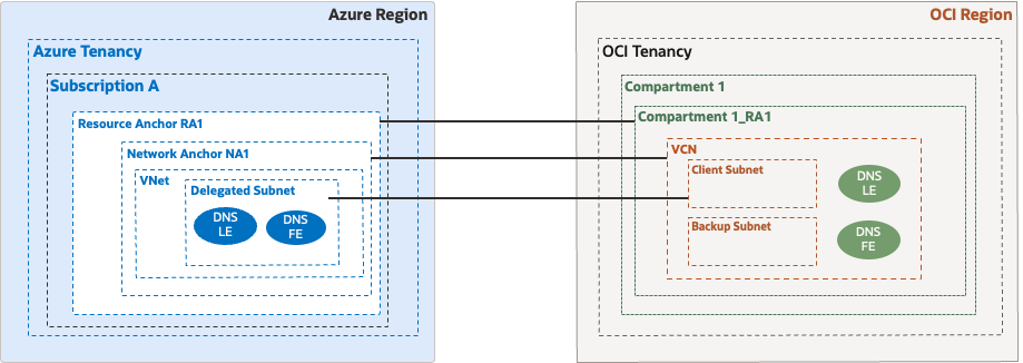 Network Anchor provides the networking bridge between Azure and OCI, integrating Azure networking constructs such as VNets, subnets, and DNS with OCI networking constructs including VCNs, subnets, and DNS. It enables seamless workload communication and consistent network management across the multicloud environment. Network Anchors also provide DNS integration capabilities, including DNS listening and forwarding endpoints, to support name resolution across Azure and OCI