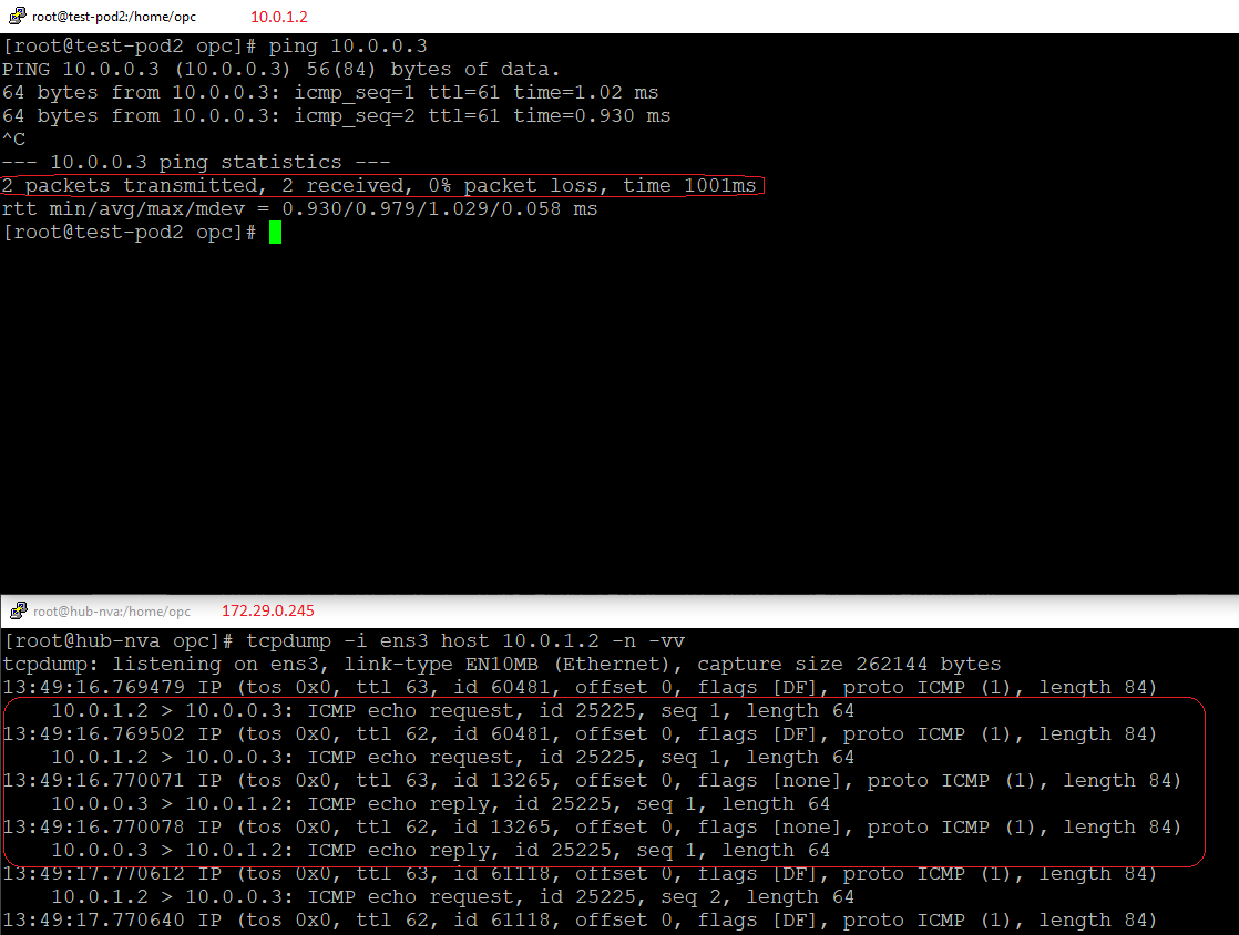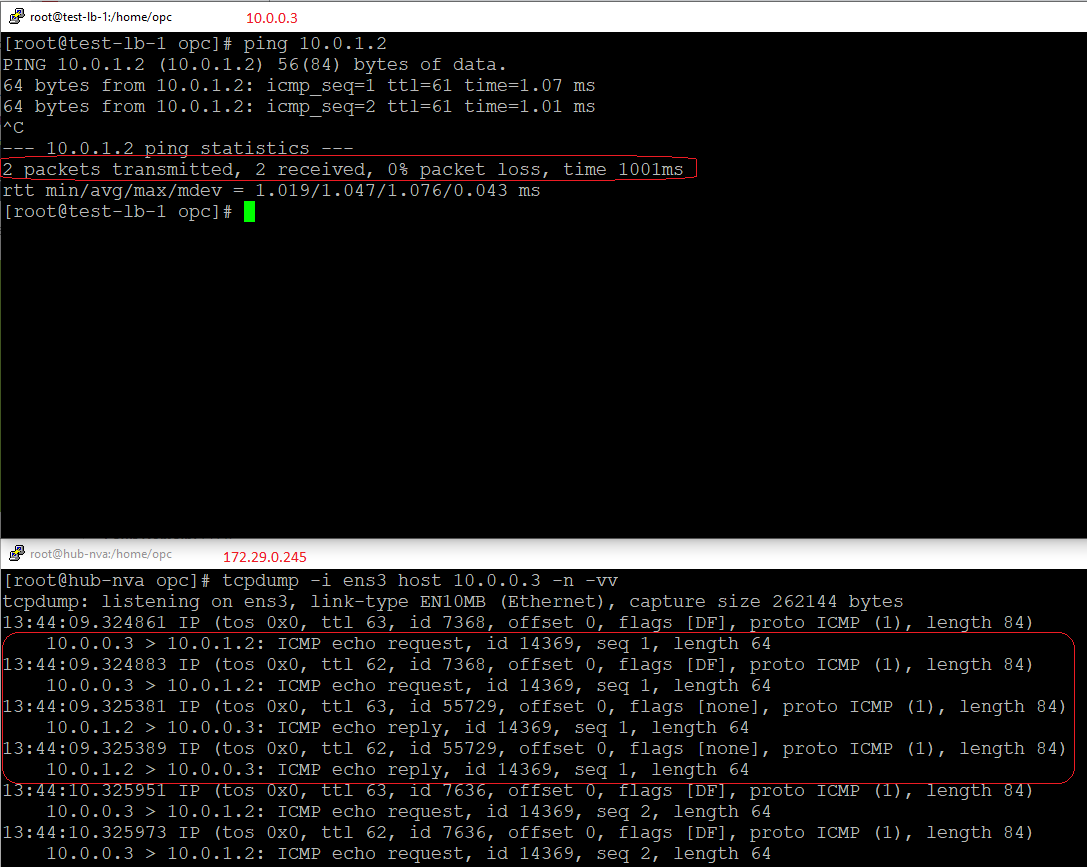 Let’s test the traffic path and check if the NVA is receiving the traffic from 10.0.0.3 to 10.0.1.2. We will start a tcpdump on 172.29.0.245 matching the IP address of 10.0.0.3: