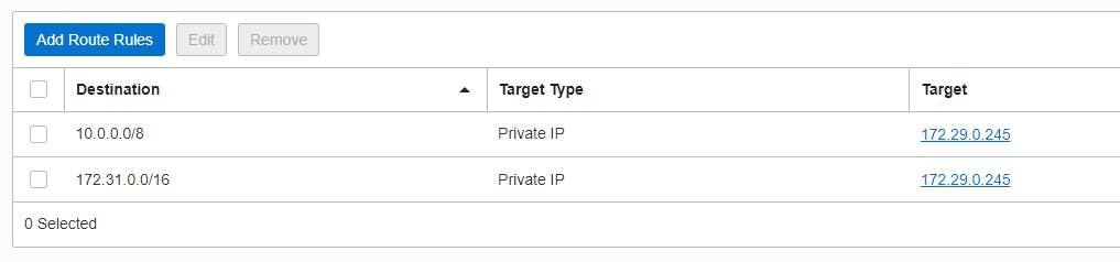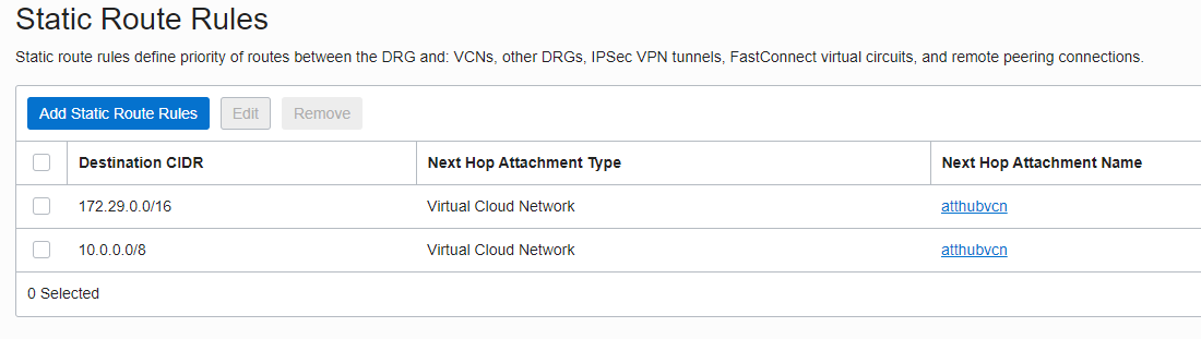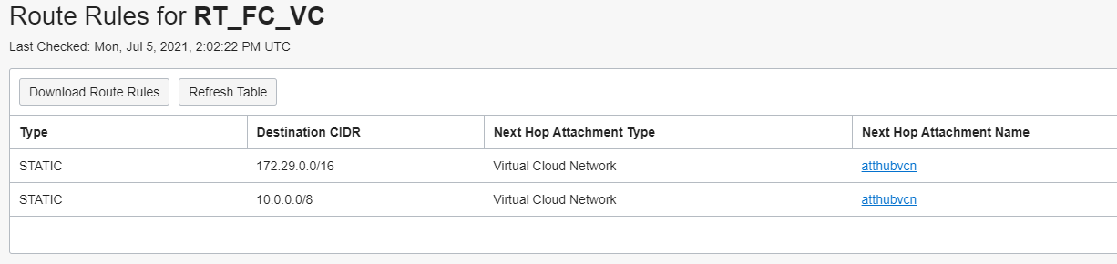 In the RT for the VC attachments we will not import anything, instead we will use just two static routes for 10.0.0.0/8 range and for NVA HUB VCN CIDR: