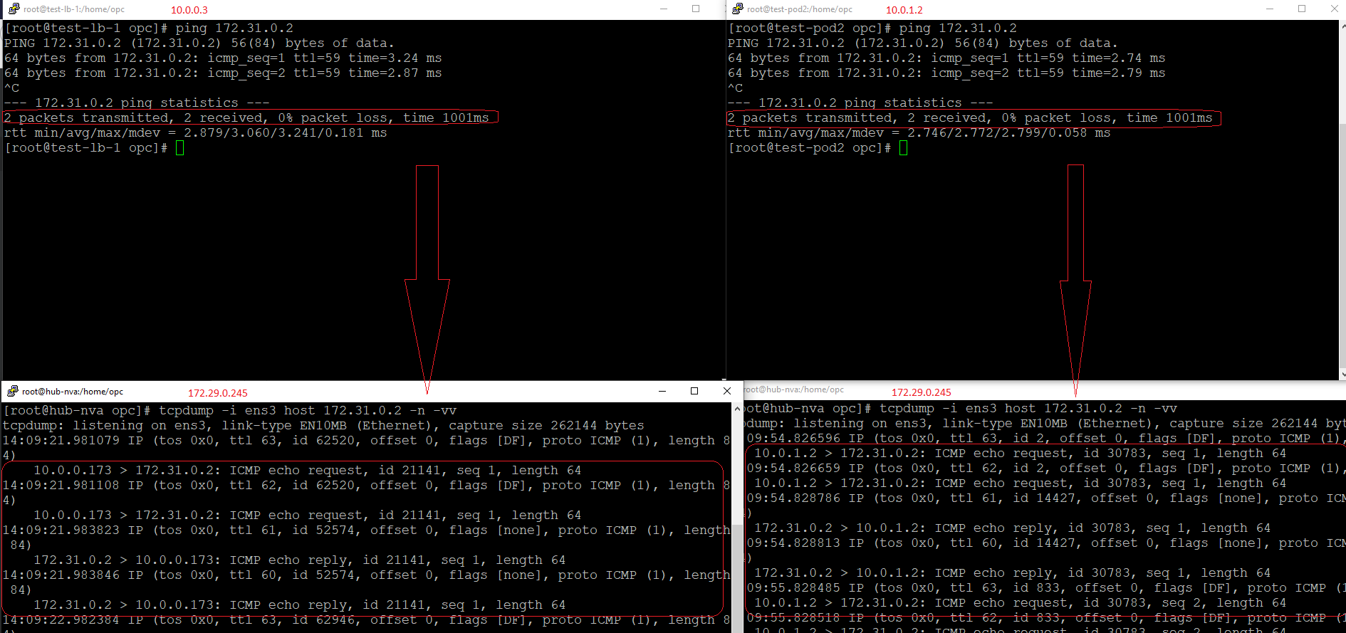 Let’s test the traffic path and check if the NVA is receiving the traffic from 10.0.1.2 to 10.0.0.3, actually we are chaning the initiator of the traffic. We will start a tcpdump on 172.29.0.245 matching the IP address of 10.0.1.2: