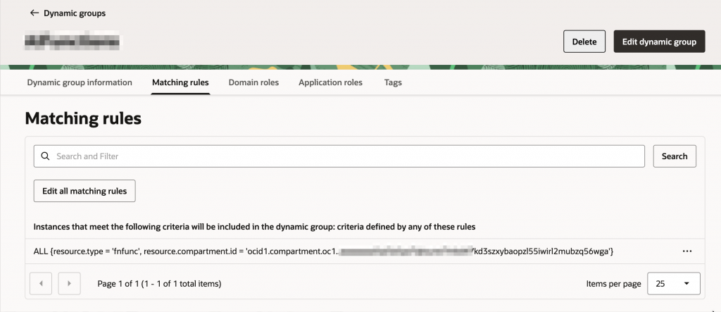 • Create a dynamic group as defined in the screenshot below. Make sure the compartment OCID is correct.