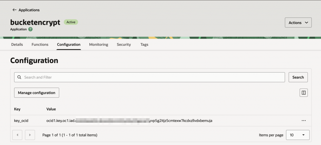 The OCI Function requires a key OCID to encrypt buckets. We can add that configuration to the OCI function.