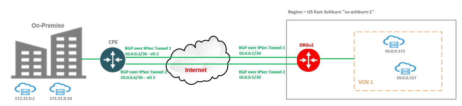 We will use two IPSec tunnels between the on-premises CPE and DRGv2 and we will run BGP on top for route exchange. The public IP addresses of the IPSec headends are not depicted in the diagram since these are not so important in our discussion. On the other hand, the IP addresses used for creating the two BGP sessions are listed, since we will perform some packet captures on the CPE vti 2 and vti 3 interfaces to see how the DRGv2 is using the paths when ECMP is activated and the traffic have different source/destination IPs per flow.
