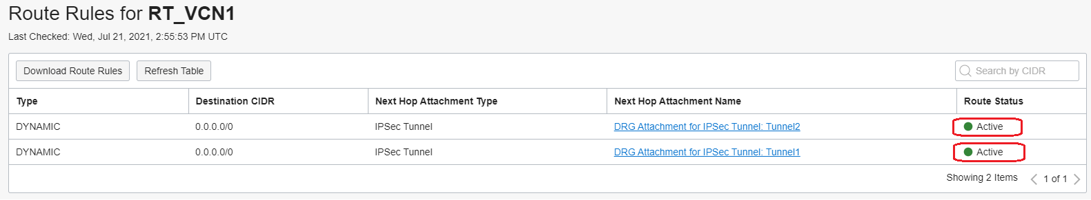 Now, we need to wait for few seconds and the routes in the Route Table will show both as Active and both will be used for traffic forwarding:
