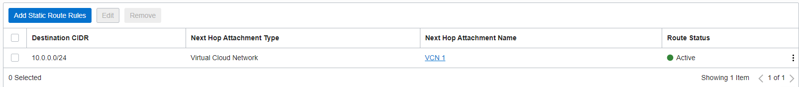 2.4. In the RT_FC_VC add a static route to the VCN 1 CIDR using VCN 1 as a next-hop attachment, the CIDR is 10.0.0.0/24