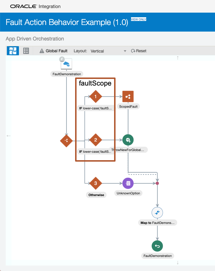 The faultScope parameter is used in the main flow of the integration to either branch into a scope or throw a new fault that will be caught by the Global Fault handler: